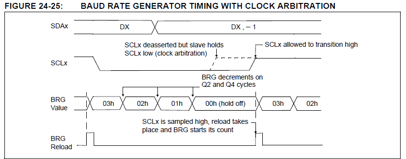Clock arbitration occurs when the master, during any receive, transmit or Repeated Start/Stop condition, releases the SCLx pin (SCLx allowed to float high). hen the SCLx pin is allowed to float high, the Baud Rate Generator (BRG) is suspended from counting until the SCLx pin is actually sampled high. When the SCLx pin is sampled high, the Baud Rate Generator is reloaded with the contents of SSPxADD<7:0> and begins counting. This ensures that the SCLx high time ill always be at least one BRG rollover count in the event that the clock is held low by an external device (Figure 24-25).