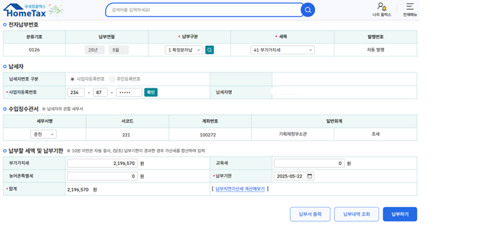 처음에 헤맸던것은 1기 부가세는 4월 25일인데 납부연월이 25년 5월로 고정되어 있는 것이였다.