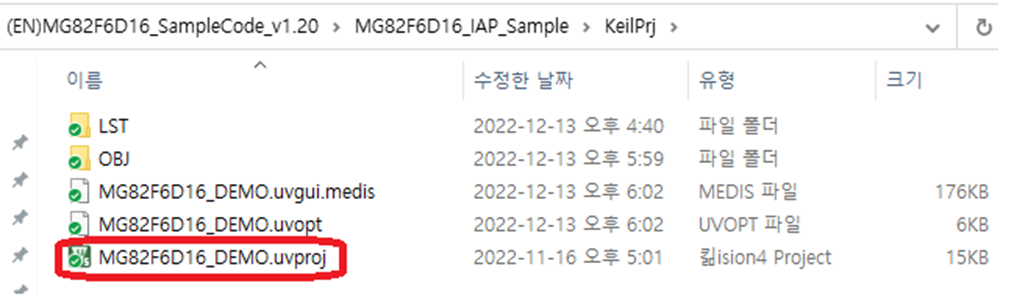 해당 폴더의 Keil project 파일을 더블 클릭하여 실행시킨다.(MG82F6D16_DEMO.uvproj)