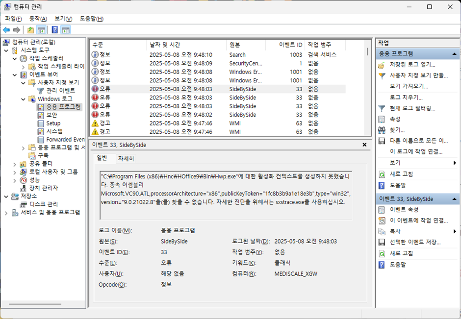 그런데 한컴오피스가 문제다 자꾸 Side-by-Side Error가 나타난다.