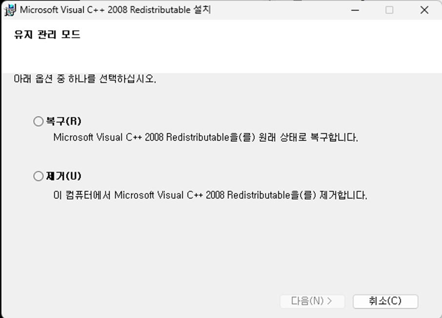 여기에서 제거, 복구 중 하나를 선택하면 된다. 복구가 나오는 것은 이미 같은 프로그램이 깔려 있어서이다.