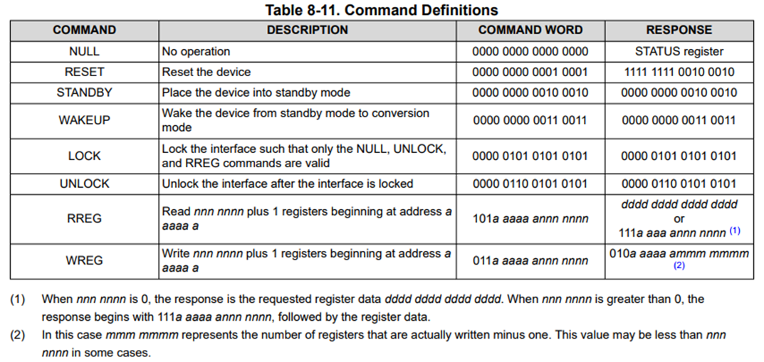 ADS131M02의 SPI 통신 프레임은 워드로 구성된다. DIN의 워드들은 명령어들, 레지스터 쓰기에 사용되는 레지스터 설정들 또는 입력 데이터의 CRC를 가지고 있다.