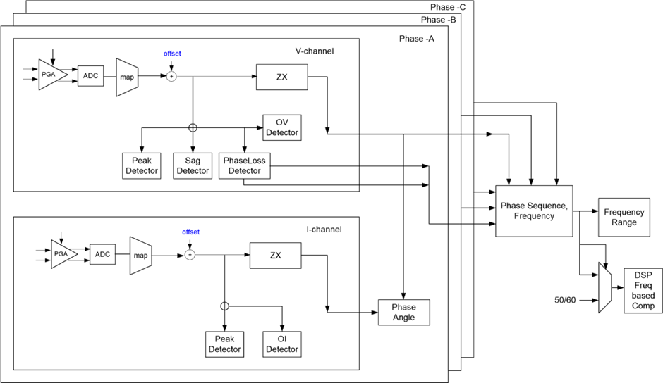 제로크로싱 검출기는 3개의 위상 각각에 대한 전압/전류의 기본 주파수의 0점 포인트를 검출한다.