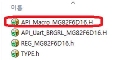 *** 위 매크로함수는 “API_Macro_MG82FG6D16.H”에서 찾아볼 수 있다.(각각의 IC별로 선언된 API_Macro_MG82FG6Dxx.H를 찾아본다.)