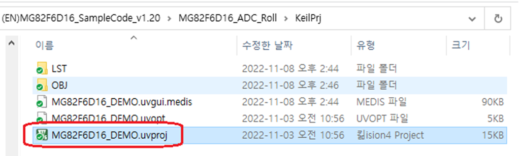 해당 폴더의 Keil project 파일을 더블클릭하여 실행시킨다.(MG82F6D16_DEMO.uvproj)
