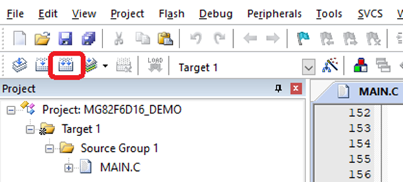 해당 폴더의 Keil project 파일을 더블 클릭하여 실행시킨다.(MG82F6D16_DEMO.uvproj)