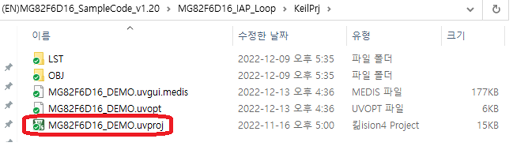 해당 폴더의 Keil project 파일을 더블 클릭하여 실행시킨다.(MG82F6D16_DEMO.uvproj)