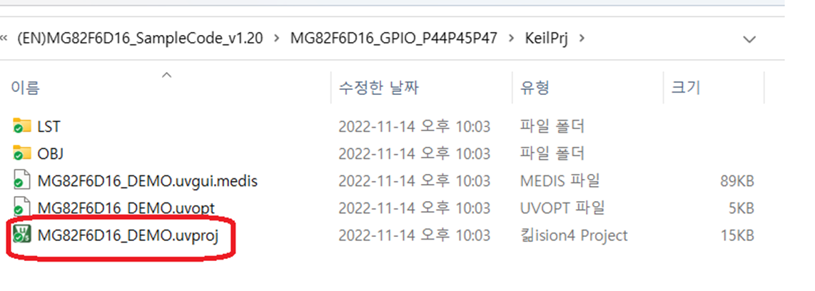 해당 폴더의 Keil project 파일을 더블 클릭하여 실행시킨다.(MG82F6D16_DEMO.uvproj)