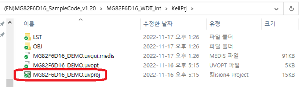 해당 폴더의 Keil project 파일을 더블 클릭하여 실행시킨다.(MG82F6D16_DEMO.uvproj)