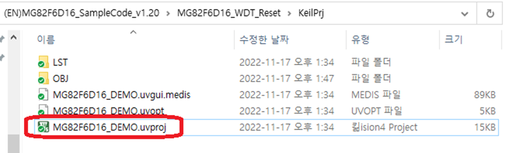 해당 폴더의 Keil project 파일을 더블 클릭하여 실행시킨다.(MG82F6D16_DEMO.uvproj)
