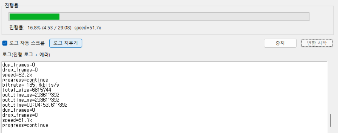 2. 변환되어 가는 과정을 로그에 나타내 줄 수 없나? ffmpeg를 실행하면 시간대별로 변환되는 것을 보여주는데. 그걸로그에 표시하면 좋을 것 같아