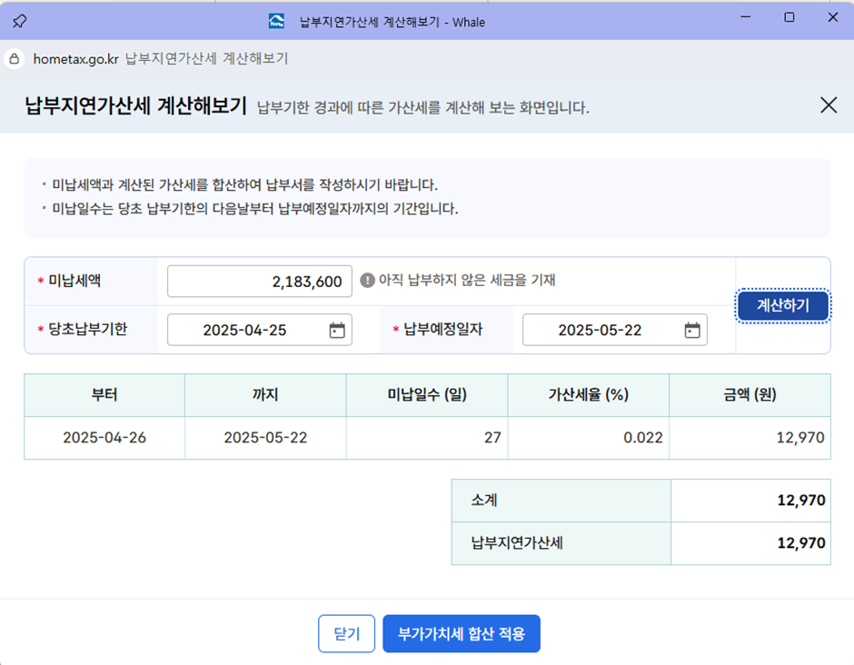 미납세액을 입력하고, 당초 납부기한, 납부예정일자를 입력하고 계산하기를 누르면 똮~~~~계산된다.